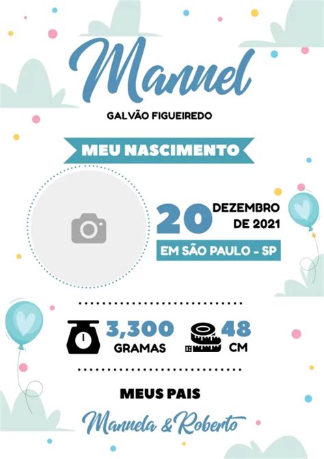 Sobre Esse Design. Modelo de Anúncio de Nascimento Editável . Denunciar este design.Celebre sua nova chegada com nossa modelo de anúncio de nascimento personalizável! Crie e compartilhe facilmente o anúncio perfeito para o seu pequeno com um design bonito e profissional."
