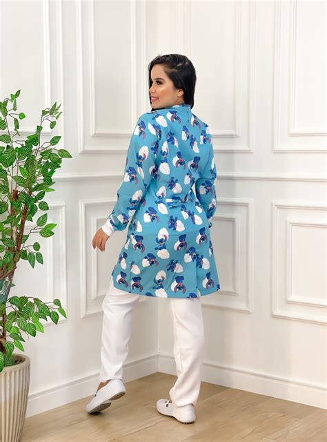 Jaleco feminino com estampa digital exclusiva de Dentinhos, feito com tecido gabardine macio e sedoso. É acinturado, possui 2 bolsos embutidos na parte inferior, cinto de amarrar, botões e punho de ribana verde água. Para você encantar nos atendimentos.