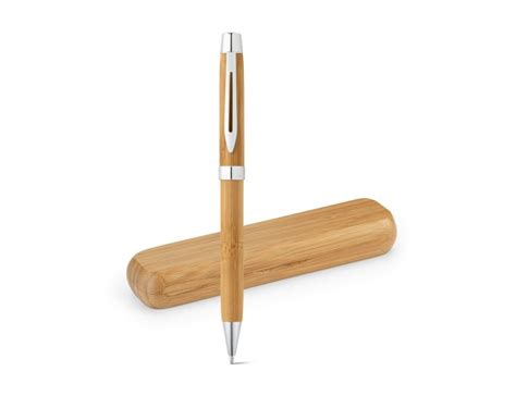 Este modelo de caneta destaca-se pela sua estética, pois o bambu proporciona uma imagem exclusiva e premium.Conjunto caneta de bambu com estojo de papel. Carga esferográfica azul e acionamento por clique.Altura : 13,5 cmLargura : 1,6 cmMedidas ap..